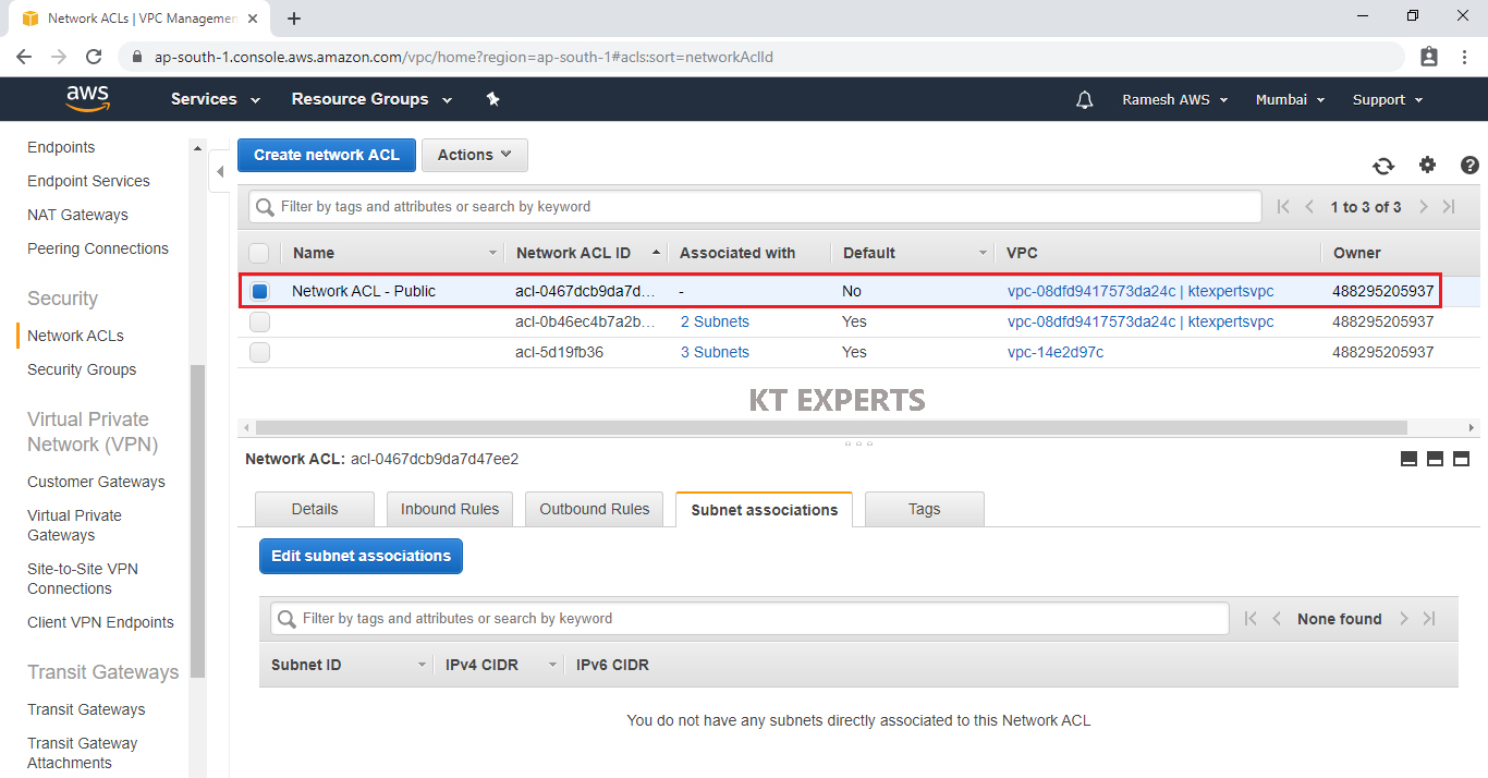 We can see the Public Network ACL “Network ACL – Public” has been connected to subnet 1 “192.168.1.0/24 – ap-south-1a (subnet-1) – (Public Subnet).