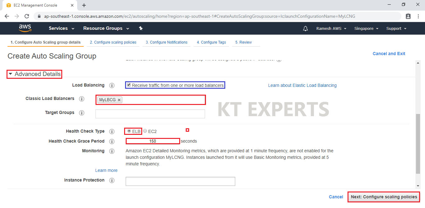 Provide classic load balancer name, health check type, health check grace period and click on Configure Scaling Polices.