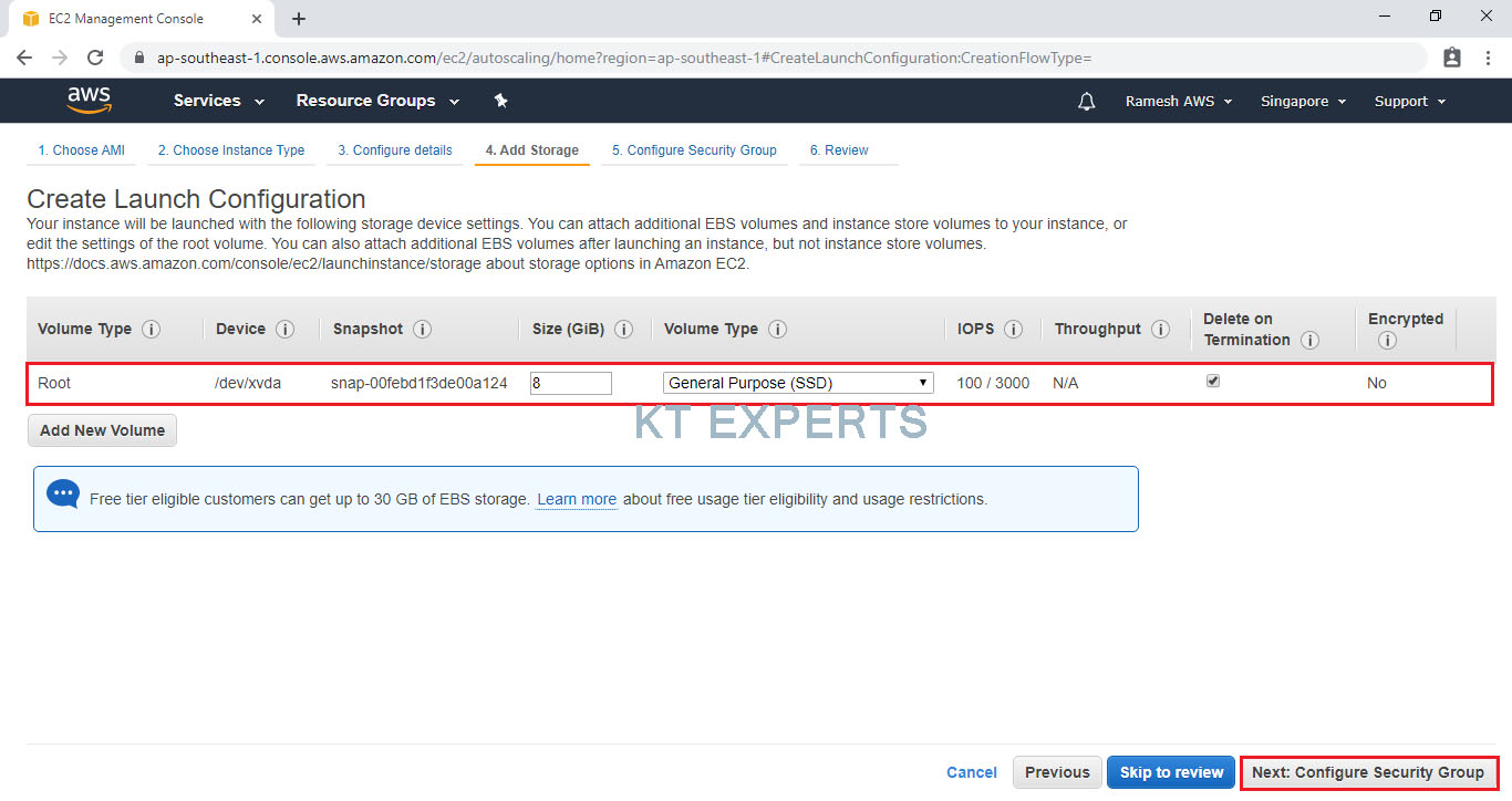 Now, in the left navigation scroll down and click on Auto Scaling. Click on the Launch Configuration button at the top.
