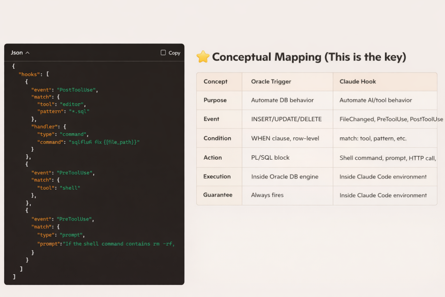 ● Right: A conceptual mapping between Oracle Triggers and Claude Hooks