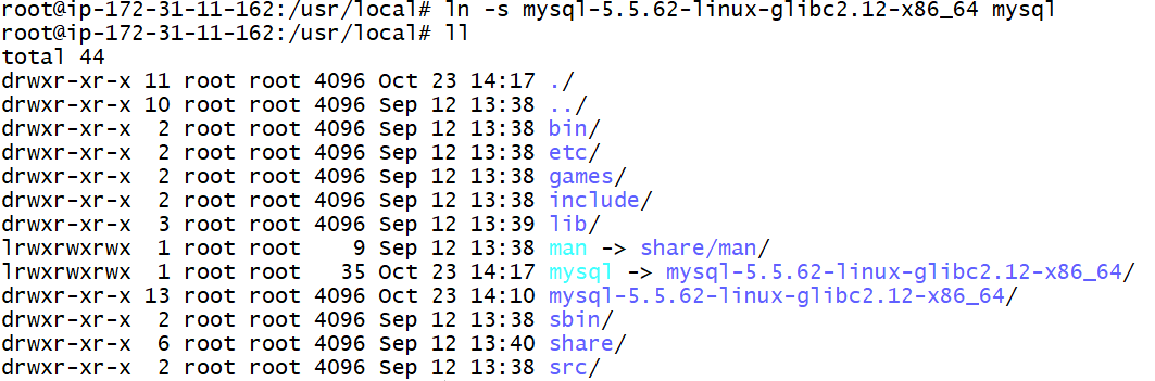 root@ip-172-31-11-162:/usr/local# ls -la total 44 drwxr-xr-x 11 root root 4096 Oct 23 14:10 . drwxr-xr-x 10 root root 4096 Sep 12 13:38 .. drwxr-xr-x 2 root root 4096 Sep 12 13:38 bin drwxr-xr-x 2 root root 4096 Sep 12 13:38 etc drwxr-xr-x 2 root root 4096 Sep 12 13:38 games drwxr-xr-x 2 root root 4096 Sep 12 13:38 include drwxr-xr-x 3 root root 4096 Sep 12 13:39 lib lrwxrwxrwx 1 root root 9 Sep 12 13:38 man -> share/man drwxr-xr-x 13 root root 4096 Oct 23 14:10<span style="color: #0000ff;"> mysql-5.5.62-linux-glibc2.12-x86_64</span> drwxr-xr-x 2 root root 4096 Sep 12 13:38 sbin drwxr-xr-x 6 root root 4096 Sep 12 13:40 share drwxr-xr-x 2 root root 4096 Sep 12 13:38 src |